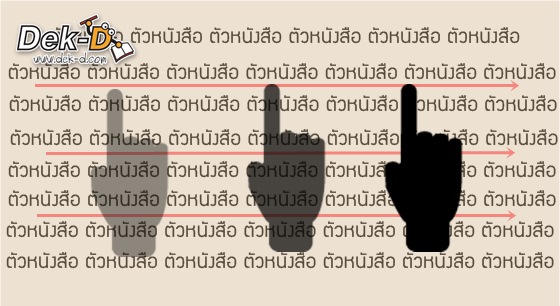 วิธีนี้จะต่างจากวิธีแรกค่ะ จะเรียกว่าแอดวานซ์กว่าเดิมก็ได้ เราจะไล่นิ้วจากบนลงล่างในจุดกึ่งกลางของบรรทัดเท่านั้น! โดยใช้สายตาเหลือบมองซ้ายขวาเป็นกรอบภาพ พูดได้เต็มปากเลยว่าเป็นการอ่านเร็วและเก็บข้อมูลได้เยอะมาก เราสามารถอ่านทีเดียวได้ทั้งบรรทัด ไวกว่าเห็นๆ แต่ต้องบอกก่อนว่า ถ้าอ่านหนังสือที่บรรทัดกว้างมากๆ แนะนำให้ใช้วิธีแรกนะคะ