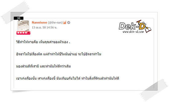 การมองหาข้อดีของตัวเอง ไม่ใช่การมองเพื่อเหยียบย้ำข้อด้อยของคนอื่นนะคะ แต่เป็นการหาข้อดีเพื่อให้เชื่อมั่นในความดีงามของตัวเราค่ะ เชื่อและภูมิใจในตัวของเราค่ะ ไม่ต้องเสียเวลาอิจฉา มาเสียเวลาหาข้อดีของตัวเองดีกว่าค่ะ