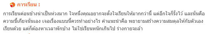 การเรียนค่อนข้างน่าเป็นห่วงมาก ใจหนึ่งคุณอยากจะตั้งใจเรียนให้มากกว่านี้ แต่อีกใจก็รั้งไว้ และนั่นคือความขี้เกียจนั่นเอง เจอเรื่องแบบนี้ควรทำอย่างไร คำแนะนำคือ พยายามสร้างความสมดุลให้กับตัวเอง เรียนด้วย แต่ก็ต้องหาเวลาพักบ้าง ไม่ใช่เรียนหนักเกินไป ร่างกายจะล้า