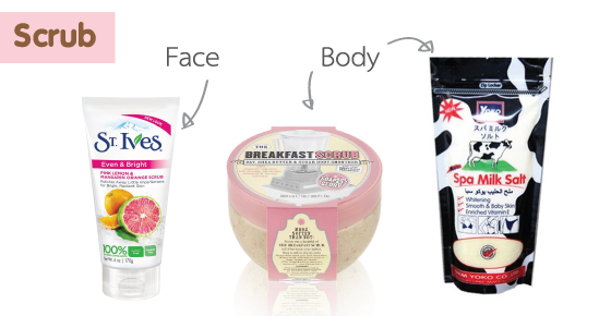 - ใช้สครับขัดผิว สำหรับผิวหน้าอาจจะต้องเลือกที่เม็ดเล็กละเอียด และไม่บาดผิวนะคะ เพราะอาจทำให้เกิดการระคายเคืองได้ง่าย และพี่ไม่แนะนำสำหรับสาวๆ ที่มีสิวอักเสบเยอะๆ เพราะตัวสครับจะยิ่งไปทำให้สิวเกิดการอักเสบมากขึ้นค่ะ ส่วนสครับที่ใช้กับตัว เลือกได้ตามอัธยาศัยเลย ใครชอบแบบโหดๆ หน่อยก็เกลือขัดผิวนี่แหละค่ะ เม็ดใหญ่บาดผิวบาดใจเลย แต่หลังขัดผิวจะสะอาดมากๆ เนียนกิ๊กเลยแหละ สครับซัก 1-2 ครั้ง ต่อสัปดาห์ก็พอนะ เยอะกว่านี้ผิวจะบางไปค่ะ