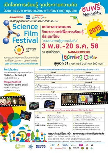 สถาบันนานมีบุ๊คส์ อินโนเวชั่น ร่วมกับ สถาบันเกอเธ่ ประเทศไทย องค์การพิพิธภัณฑ์วิทยาศาสตร์แห่งชาติ (อพวช.) และ สถาบันส่งเสริมการสอนวิทยาศาสตร์และเทคโนโลยี (สสวท.) กระทรวงศึกษาธิการ ขอเชิญครู นักเรียน และประชาชนทั่วไป ร่วมงาน เทศกาลภาพยนตร์วิทยาศาสตร์เพื่อการเรียนรู้แห่งประเทศไทย ครั้งที่ 11 (Science Film Festival) ภายใต้หัวข้อ “2558 ปีสากลแห่งแสง และเทคโนโลยีแสง” พบกับภาพยนตร์วิทยาศาสตร์ที่ผ่านการคัดเลือกและได้รับรางวัลจาก 11 ประเทศ โดยแบ่งออกเป็น 2 ประเภท ได้แก่ ภาพยนตร์สาระบันเทิง และ ภาพยนตร์วิทยาศาสตร์ทั่วไป อาทิ แสงเหนือ ประสบการณ์มหัศจรรย์, แสงสว่างแห่งบรัสเซลส์, ความลับของแสงนีออน เป็นต้น
