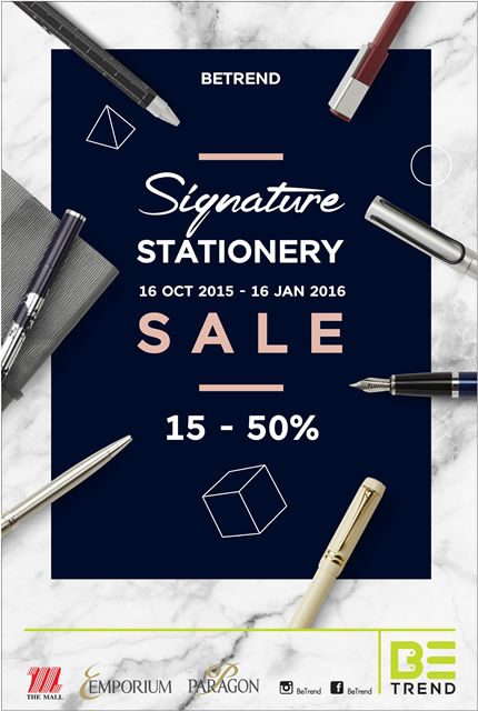 ปัจจุบันความเป็นแฟชั่นได้ครอบคลุมไปทั่วทุกที่ ผู้คนคำนึงถึงภาพลักษณ์และมีไลฟ์สไตล์ตามเทรนด์ อุปกรณ์เครื่องเขียนก็เช่นกัน เรียกได้ว่าเป็นส่วนหนึ่งที่จะสะท้อนภาพลักษณ์ของผู้ใช้ตามสไตล์ของแต่ละคน ดังนั้นเพื่อให้ทุกการขีดเขียนเป็นเรื่องสนุกและตอบโจทย์ทุกไลฟ์สไตล์ได้อย่างสมบูรณ์แบบ BeTrend เดอะมอลล์กรุ๊ป แหล่งรวมสินค้าไลฟ์สไตล์ จึงจัดงาน “BETREND SIGNATURE STATIONERY 2015”(บีเทรนด์ ซิกเนเจอร์ สเตชั่นเนอรี่ 2015) นำเสนอเครื่องเขียนคุณภาพดีจากแบรนด์ชั้นนำกว่า 120 แบรนด์ ที่จะช่วยสร้างแรงบันดาลใจให้แก่การเรียนการทำงานมากขึ้น และยังรวบรวมเครื่องเขียนไว้ครบทุกดีไซน์ที่จะทำให้การเลือกเครื่องเขียนคู่ใจไม่เป็นเรื่องยากอีกต่อไป และที่สำคัญงานนี้มาพร้อมกับส่วนลดสูงสุดถึง 50% ตั้งแต่วันที่ 16 ตุลาคม 2558 – 16 มกราคม 2559 ที่ BETREND เดอะมอลล์ ทุกสาขา เอ็มโพเรียม และพารากอน ดีพาร์ทเม้นท์สโตร์