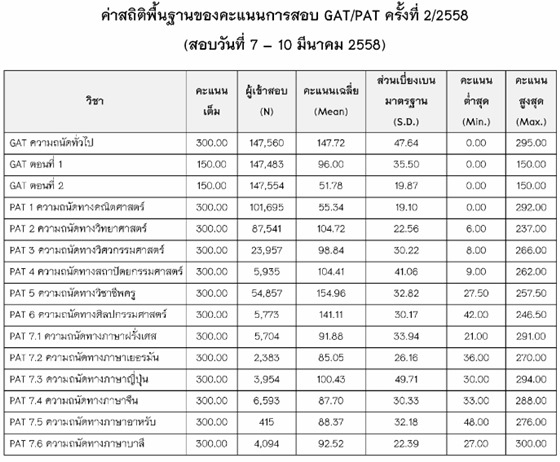 GAT PAT : น้องๆ ที่ได้สอบรอบแรกไปก็ได้ผ่านประสบการณ์ของการสอบ GAT PAT เป็นที่เรียบร้อย กลุ่มนี้ถือว่ายากที่สุดเมื่อเทียบกับ 3 กลุ่มข้อสอบ เพราะเน้นความเป็นวิชาชีพสมชื่อ "การทดสอบความถนัดทางวิชาชีพ" โดยแบ่งเป็น 8 วิชาคือ ความถนัดทั่วไป (GAT), ความถนัดทางคณิตศาสตร์ (PAT1), ความถนัดทางวิทยาศาสตร์ (PAT2), ความถนัดทางวิศวกรรมศาสตร์ (PAT3), ความถนัดทางสถาปัตยกรรมศาสตร์ (PAT4), ความถนัดทางวิชาชีพครู (PAT5), ความถนัดทางศิลปกรรมศาสตร์ (PAT6) และความถนัดทางภาษาต่างประเทศ (PAT7) โดยแบ่งย่อยออกเป็น 6 วิชาย่อย