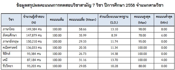 O-NET : ถึงจะสอบหลังสุด แต่ง่ายที่สุด ถ้าไปดูค่าเฉลี่ยจะเห็นว่าวิชานี้ Mean ของประเทศจะสูงกว่าการสอบอย่างอื่นค่ะ O-NET เราต้องสอบทุกคน เพราะเป็นการทดสอบทางการศึกษาขั้นพื้นฐาน เป็นการบังคับสอบอยู่แล้ว ฉะนั้นข้อสอบของ O-NET ก็จะไม่ยาก เพราะต้องเอาสิ่งที่เป็นความรู้พื้นฐานที่เรียนมามาวัดผลนักเรียนทั้งประเทศ และสำหรับ O-NET ปีนี้ก็เป็นปีแรกที่เปลี่ยนจำนวนวิชาสอบค่ะ จากเดิม 8 วิชาคือ ภาษาไทย, สังคมศึกษา, ภาษาอังกฤษ, คณิตศาสตร์, วิทยาศาสตร์, สุขศึกษา, พลศึกษา, ศิลปะ, การงานอาชีพและเทคโนโลยี แต่ในปีนี้ สทศ. จัดสอบเหลือเพียง 5 วิชาหลัก คือ ภาษาไทย สังคมศึกษา ภาษาอังกฤษ คณิตศาสตร์ และวิทยาศาสตร์