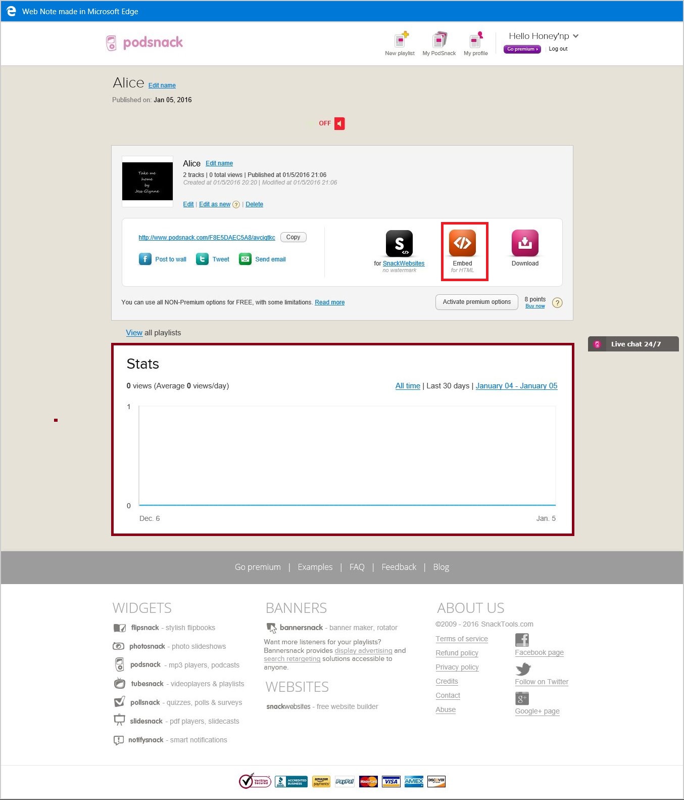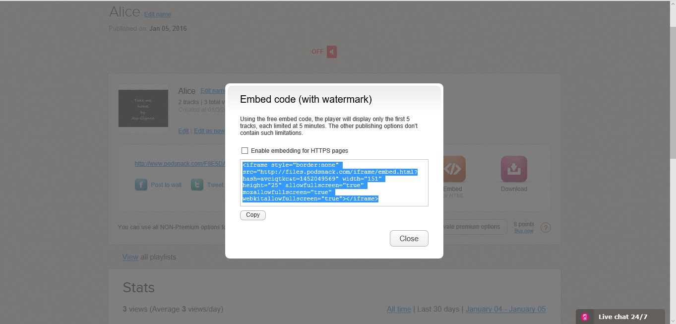 และนี่เป็นขั้นตอนสุดท้ายของกล่องเพลงเราแล้ว ส่วนที่เป็นกรอบสีเลือดหมูจะเป็นสถิติบอกจำนวนคนเยี่ยมชมกล่องเพลงเราค่ะ ส่วนตัวโค้ดจริงๆ ที่เราจะนำไปใช้จะอยู่ในกรอบสีแดงที่เขียนว่า Embed ค่ะ ให้เราคลิกเลย แล้วมันจะเด้งมาหน้าตาอย่างนี้