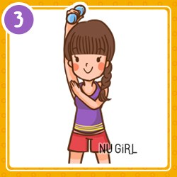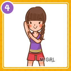 ข้อศอกอยู่ที่บริเวณข้างหู ห้ามขยับ หายใจเข้า พร้อมกับงอแขนท่อนล่างไปด้านหลัง จนข้อมือแตะท้ายทอย