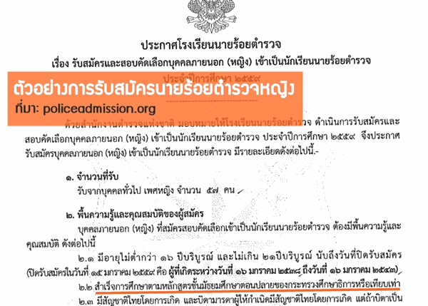 น้องผู้หญิงเฮ รับเทียบเท่าด้วยนะ! ถ้าสอบเข้าโรงเรียนตำรวจนายร้อยหญิงได้ เรียนจบนอกจากได้รับราชการเป็นนายตำรวจแล้ว โดยวุฒิเทียบถือว่าจบปริญญาตรีด้วยจ้า แต่ข้อสอบเข้าวิชาสามัญจะใกล้เคียงข้อสอบทางมัธยมปลายสายวิทย์-คณิตนะจ๊ะ