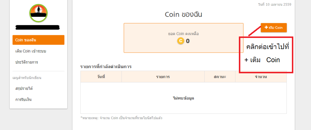 2. มันจะเด้งมาที่หน้าระบบ Coin ของเรา ให้สังเกตมุมขวา จะมี + เติม Coin ให้คลิกเข้าไปที่ตรงนั้น