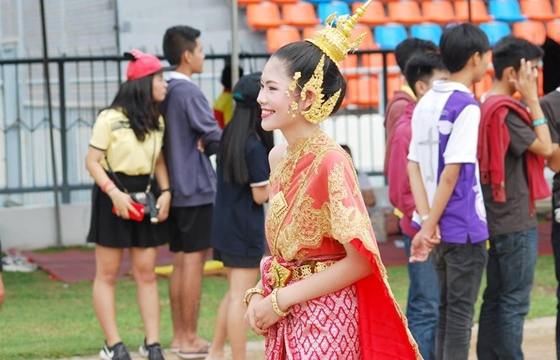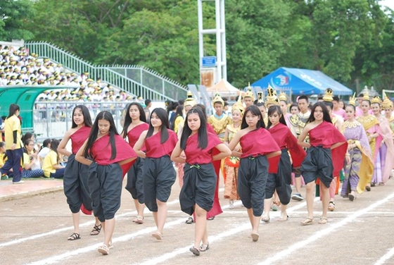 ชุดพละ เสื้อสีเหลือง ขลิบแดง บนเสื้อ ปักเหมือนกับชุดนักเรียนครับแต่เป็นสีแดงทั้งหมด กางเกงพละขายาวสีกรมท่า ขลิบสีเหลืองแดง