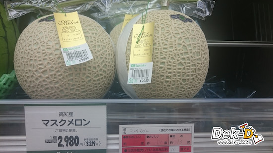และข้างบนเป็นรูปผลไม้ที่หลายๆ คนโปรดปรานและใฝ่ฝันอยากจะมากินที่ญี่ปุ่นครับ มันคือเจ้าเมลอนนั่นเอง เมลอนญี่ปุ่นเป็นที่รู้จักกันว่าหอมหวาน ลายสวย เนื้อแน่น ฉ่ำ เป็นผลไม้ฤดูร้อนครับ ที่ดังๆ ก็เช่นแหล่งปลูกที่ฮอกไกโดเป็นต้น ตามห้างที่หรู สามารถเห็นลูกหนึ่งราคาเป็นหมื่นๆ ได้เป็นเรื่องทั่วไปครับ อย่างที่เห็นนี่เบาๆ ประมาณ 3,219 เยนหรือประมาณ 600 กว่าบาทครับ อย่าลืมนะว่านี่แค่ร้านแถวบ้าน แต่ก็ราคาโหดพอตัว อย่างไรก็ดี เมลอนช่วงเดือนพฤษภาคมถือว่าเร็วเกินไปครับ ฤดูของเมลอนจริงๆ จะมาสักเดือน 7-8 ครับ
