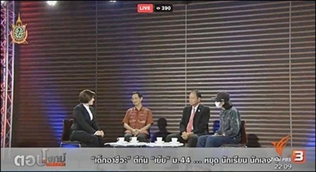 ขอขอบคุณ การพูดคุยดีๆ จากรายการตอบโจทย์ ช่อง ThaiPBS และติดตามรายการเต็มๆ ตอน "เด็กอาชีวะตีกัน เย้ยมาตรา 44 หยุดนักเรียน นักเลง?" ได้ทาง ย้อนหลังรายการตอบโจทย์ และ live facebook (video)