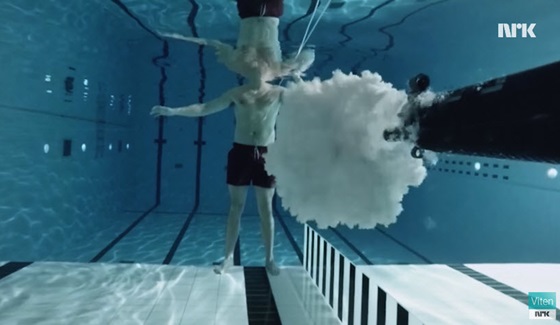 และสิ่งที่สมกับความเป็นวิทยาศาสตร์ก็คือ การทดลองให้เห็นกับตานั่นเอง แต่เดี๋ยวก่อน! พี่มิ้นท์ไม่ได้เป็นคนทดลองนะคะ >< เพราะมีอาจารย์นักฟิสิกส์ชาวนอร์เวย์ทดลองให้เราดูแล้ว เขาคนนั้นคือ Andreas Wahl ได้เอาตัวเองเป็นเดิมพันในการทดลองยิงปืนในน้ำ เพื่อพิสูจน์เรื่องการเคลื่อนที่ในน้ำ