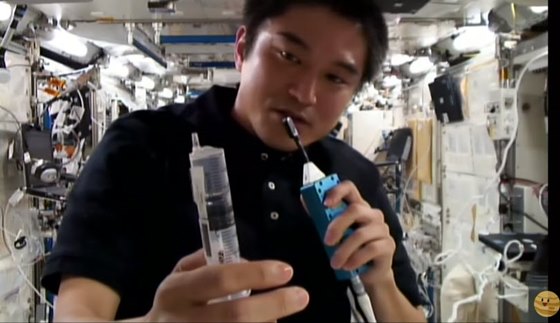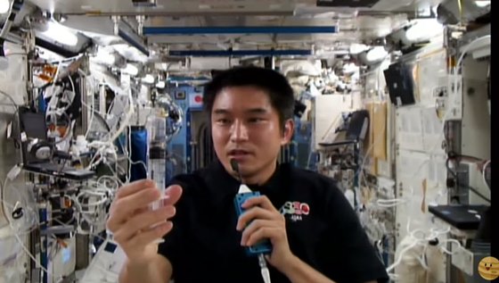 การทดลองครั้งนี้ ได้เลือกใช้น้ำ 3 ชนิดมาทำการทดลองในหลอดเข็มฉีดยาครับ ได้แก่ น้ำเปล่า น้ำผลไม้ และน้ำมัน ที่เลือก 3 ชนิดนี้ เพราะมีความเข้มข้นและความหนาแน่นที่ต่างกัน ซึ่งการทดลองบนพื้นโลก พบว่าน้ำเปล่าและน้ำผลไม้ พื้นผิวบนของเหลวจะเรียบไม่โค้งนูนหรือเว้าลง ส่วนน้ำมันจะมีพื้นผิวที่เว้าลงเล็กน้อย