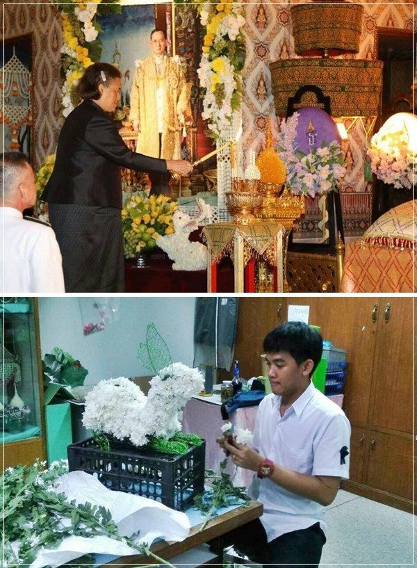 กับงานกระต่ายดอกไม้วางหน้าพระบรมฉายาลักษณ์ข้างพระบรมโกศ ณ พระที่นั่งดุสิตมหาปราสาท