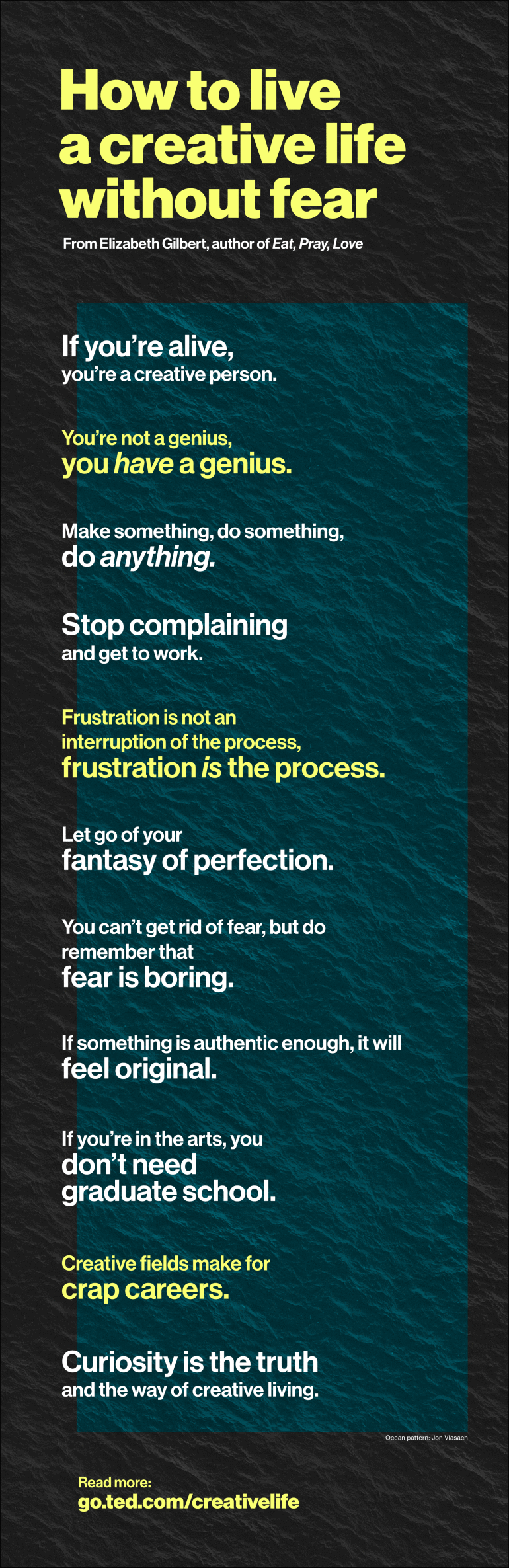 ก่อนจากกันพี่ก็นำ infographic สรุปสิ่งที่อลิซาเบธ กิลเบิร์ตบอกเราเกี่ยวกับการใช้ชีวิตให้ครีเอทีฟสุดๆ ค่ะ ซึ่งอยู่ด้านล่างเลย อย่าลืมเลื่อนมาอ่านด้วยนะ ส่วนคราวหน้าพี่น้ำผึ้งจะนำเรื่องอะไรมาฝาก อย่าลืมติดตามกันนะคะ ^^