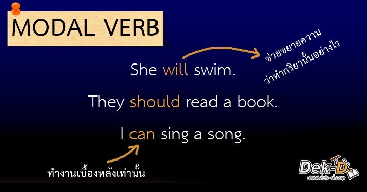BE: "กลุ่มที่ 2 คือ Modal Verb (โมดัล เวิร์บ) เป็นกริยาช่วย ทำหน้าที่อยู่เบื้องหลังกริยาทั่วไป คอยช่วยขยายความว่าประธานทำกริยานั้นอย่างไร Modal Verb มีแค่ไม่กี่ตัว ที่เจอบ่อยๆ ก็ will would shall should can could may might"