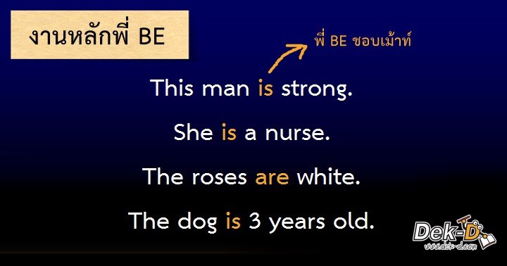 BE: "ทีนี้ก็มาถึงตัวพี่ BE ค่ะ พี่จัดเป็นกริยากลุ่มที่ 3 หรือกริยาที่มีอภิสิทธิ์เหนือกว่าชาวบ้าน เราเรียกกริยากลุ่มนี้ว่า Primary Verb (ไพรมารี่ เวิร์บ) นอกจากพี่ BE ก็ยังมีน้อง HAVE กับน้อง DO ค่ะ"