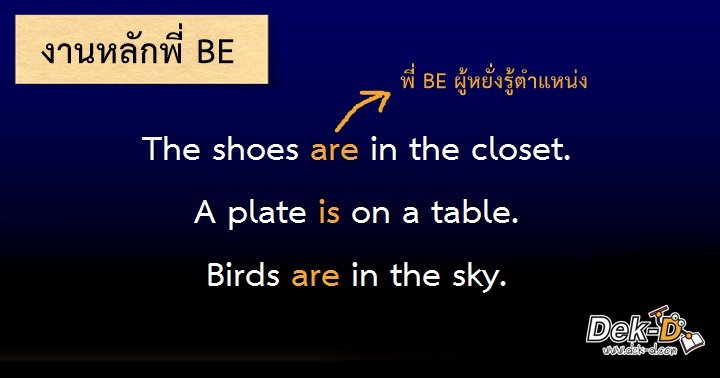 BE: "ก็ไม่อะไรมากค่ะ พี่อยากจะเตือนน้องๆ ว่าต้องแยกให้ออกนะคะว่าจะจ้างพี่ไปทำงานเบื้องหน้าหรือเบื้องหลัง มันคนละเรตกันค่ะ ถ้าจะให้พี่ไปเป็นกริยาหลักของประโยค พี่จะมีความหมายว่า เป็น, อยู่, คือ แต่ถ้าให้พี่ไปทำเบื้องหลังเป็นกริยาช่วย พี่ต้องมีกริยาอีกตัวมาให้พี่ช่วย ซึ่งพี่จะช่วยเฉพาะกริยาที่อยู่ในรูป V.ing กับ V.3 เท่านั้นนะคะ ตัวอื่นพี่ไม่ช่วยค่ะ"