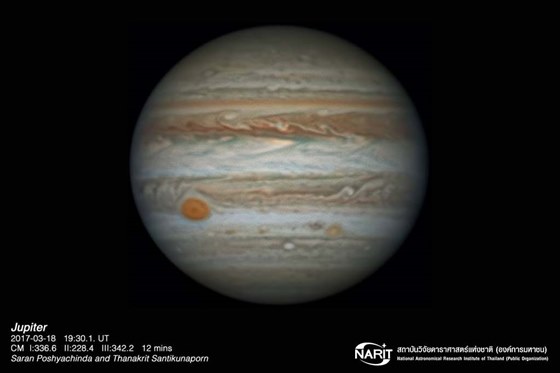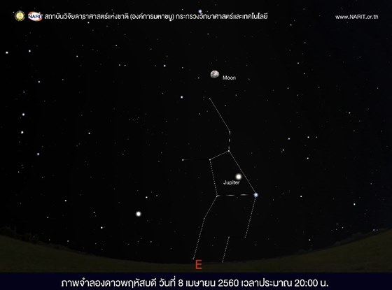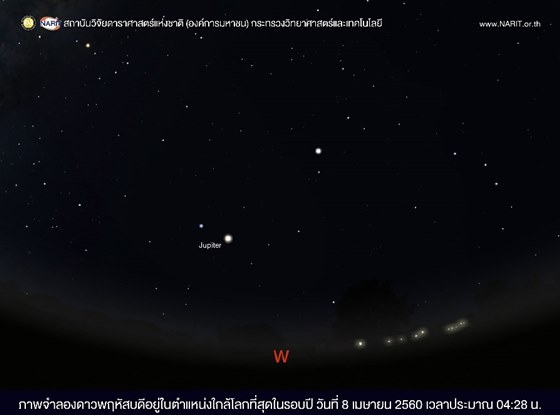 ดร.ศรัณย์ โปษยะจินดา รองผู้อำนวยการสถาบันวิจัยดาราศาสตร์แห่งชาติ (องค์การมหาชน) เปิดเผยว่า ช่วงต้นเดือนเมษายนดาวพฤหัสบดีจะโคจรมาอยู่ในตำแหน่งตรงข้ามกับดวงอาทิตย์ นึกภาพตามคือ ดวงอาทิตย์ โลก และดาวพฤหัสบดี เรียงอยู่ในเส้นตรงเดียวกัน และเข้ามาใกล้โลก ในตำแหน่งใกล้โลกมากที่สุดในรอบปี ที่ระยะทางประมาณ 667 ล้านกิโลเมตร (ปกติไกลที่สุด 816 ล้านกิโลเมตร) ตรงกับในช่วงรุ่งเช้าของวันที่ 8 เมษายน 2560 เวลาประมาณ 04:28 น.