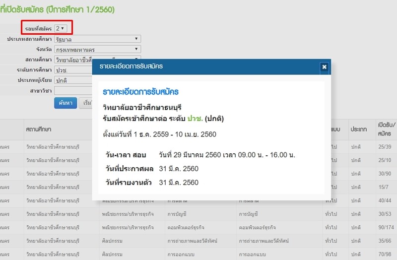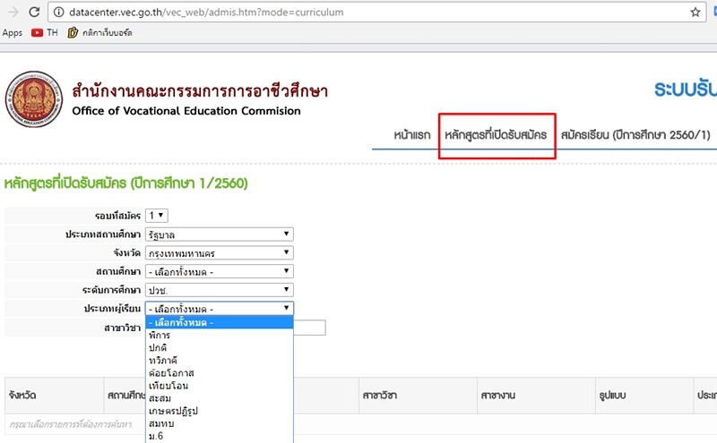 หน้าแรกที่เข้าไปเจอก็จะมีรายละเอียดต่างๆ ตามภาพ และเราสามารถค้นหาหลักสูตรที่เราต้องการได้ค่ะ เช่น จะต่อ ปวช. ในกรุงเทพฯ ก็เลือกแถบ "หลักสูตรที่เปิดรับสมัคร" ตามตัวอย่างตรงกรอบสีแดงภาพล่าง