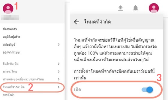 สำหรับบ้านไหนที่มีลูกเด็กเล็กแดง น้องๆ หนูๆ ชอบเปิดดู Youtube บ่อยๆ ในคอมพิวเตอร์ พ่อ แม่ พี่ น้อง ก็สามารถควบคุมดูแลความปลอดภัยให้ลูกหลานได้ โดยเริ่มต้นจากลงชื่อเข้าใช้ ต้องมีแอคเคาท์เป็นของตัวเองก่อนนะคะ แล้วเข้าไปตรงโหมดที่จำกัด (Restricted Mode) แล้วกดเปิดให้ปุ่มกลายเป็นสีเขียว เพียงเท่านี้ Youtube ของน้องๆ ก็จะคลีน สะอาดใส ไร้มลพิษ เด็กเล่นได้ ผู้ใหญ่เล่นดี อ่อ แล้วอย่าลืมไปเปิดโหมดนี้ในมือถือด้วยล่ะ เผื่อเด็กๆ แอบจิ๊กไปใช้ จะได้ไม่จ๊ะเอ๋กับคลิปที่ไม่เหมาะสม