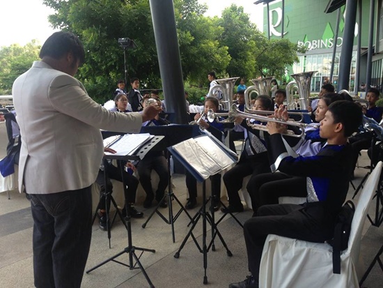 เรามักเห็นภาพที่คนในวงโยฯ ซ้อมเช้าซ้อมเย็น ต้องกลับบ้านดึก เราจึงสงสัยว่าที่นี่ซ้อมหนักขนาดนั้นไหม? “เคยเป็นอย่างนั้นครับ แต่ตอนนี้เปลี่ยนใหม่ เน้นซ้อมวันหยุด ตั้งแต่ 9.00 – 16.00 น. ถ้าวันอาทิตย์จะซ้อมแค่ถึงเที่ยง ส่วนวันเรียนจะซ้อมไม่ค่อยได้ เพราะเขาต้องเรียน ถ้าจำเป็นจริงๆ ก็แค่ตอนเย็นๆ 2 ชั่วโมง” ตอนซ้อมโหดไหม? “ไม่โหดครับ ไม่ลงแดด เหนื่อยตรงที่ต้องถือเครื่องเดินตลอด”