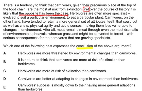*ระวังบางข้ออาจจะมี 2 ประโยค จะดูยังไงว่าอันไหนเป็น main ให้ลองเติม therefore ระหว่างสองประโยคเพื่อดูว่ามันสัมพันธ์กันยังไง อันที่อยู่หลัง therefore นี่แหละคือ main conclusion