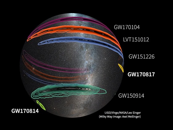 ภาพแสดงตำแหน่งของคลื่นความโน้มถ่วงที่ถูกค้นพบ และบริเวณที่คาดว่าจะเป็นตำแหน่งของแหล่งกำเนิดของคลื่นความโน้มถ่วงทั้ง 5 สัญญาณ โดยคลื่นความโน้มถ่วง GW170817 เป็นสัญญาณคลื่นความโน้มถ่วงที่สามารถตรวจจับได้ล่าสุด