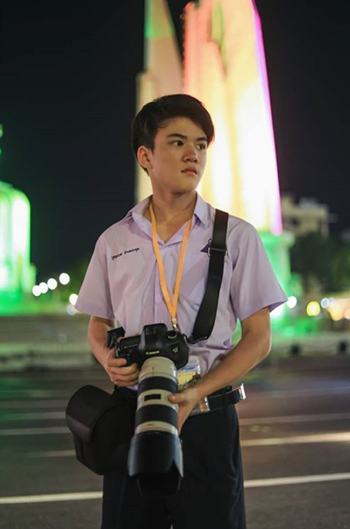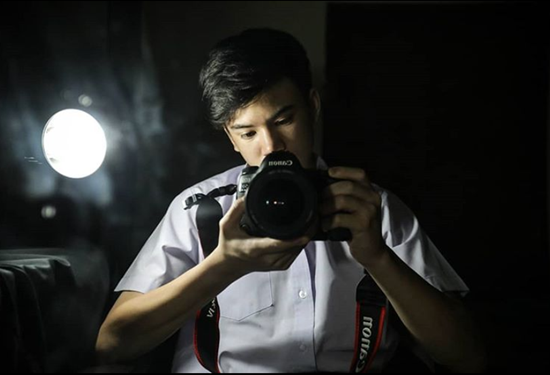 อยากให้เล่าจุดเริ่มต้นของการถ่ายภาพให้ฟัง "ตอน ม.2 ผมเริ่มถ่ายรูปประกวดจากกล้องมือถือ แล้วภาพของผมก็ถูกนำไปแสดงที่หอศิลป์ เลยตัดสินใจซื้อกล้องมาเล่นครับ ช่วงแรกใช้กล้องไม่เป็นเลย Auto อย่างเดียว แล้วให้ครูฝ่ายโสตฯ ช่วยสอนตั้งค่ากล้อง ส่วนเทคนิคต่างๆ ผมจะดูจากเน็ต แล้วโรงเรียนก็มีวิชาสอนถ่ายภาพด้วย ผมฝึกเรื่อยๆ จนมั่นใจถึงจะกล้ารับงานครับ"