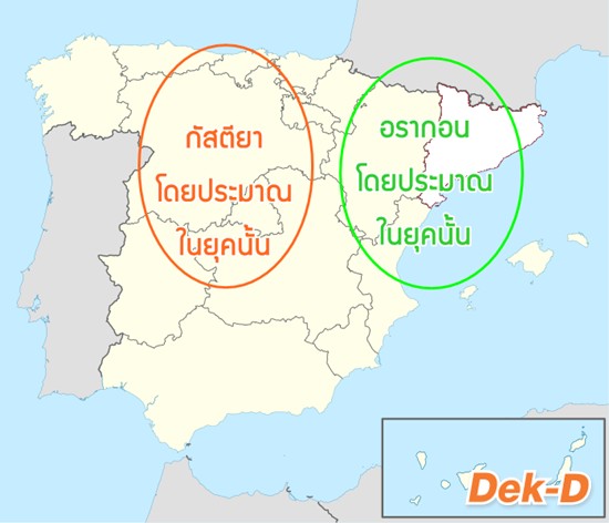 แผนที่แสดงตำแหน่งกัสตียาและอรากอนโดยประมาณเมื่อตอนที่พระราชาและพระราชินีของทั้งสองบัลลังก์แต่งงานกัน