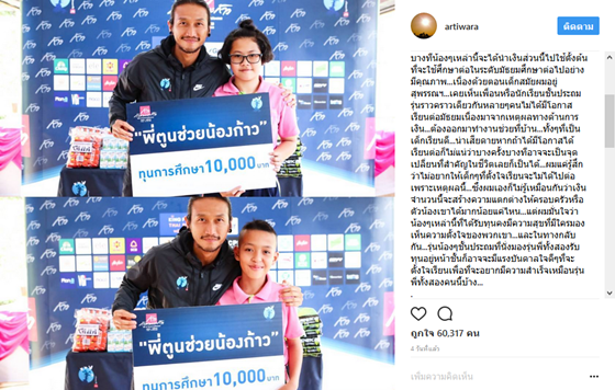 อย่างที่ทราบกันว่าตอนนี้พี่ตูนกำลังวิ่งในโครงการ “ก้าวคนละก้าว” เพื่อหารายได้ช่วยโรงพยาบาลอยู่ ซึ่งในช่วงพักกลางวันก็ยังแบ่งเวลาไปมอบทุนการศึกษาให้กับโรงเรียนที่วิ่งผ่าน และมอบทุนการศึกษาจากเงินส่วนตัว จำนวน 100 ทุน ทุนละ 10,000 บาท ให้กับน้องๆ ชั้นประถมศึกษาปีที่ 6 ที่เรียนดีแต่ขาดแคลน เพื่อให้น้องๆ นำเงินไปใช้ตั้งต้นในการศึกษาต่อระดับมัธยมศึกษาต่อไปอย่างมีคุณภาพ