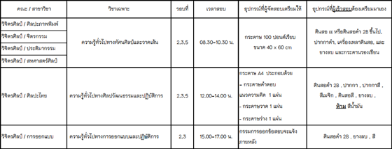 สำหรับน้องๆ ที่สมัครเข้าศึกษาคณะวิจิตรศิลป์ จะต้องสมัครสอบวิชาทักษะเฉพาะ ภายในวันที่ 23 – 30 พฤศจิกายน 2560 ทางเว็บไซต์ด้วยนะคะ โดยจะจัดสอบที่มหาวิทยาลัยเชียงใหม่ระหว่าง วันที่ 10-11 มีนาคม 2561 ตามรายละเอียดด้านล่างนี้