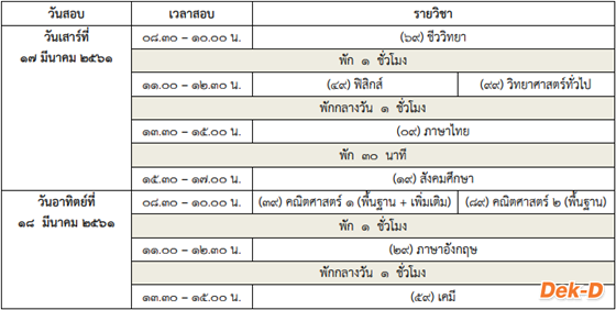 จัดสอบในวันที่ 17 – 18 มีนาคม 2561 โดยแต่ละวิชา มีเวลา 1 ชั่วโมง 30 นาที