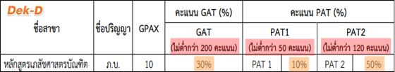 สำหรับเกณฑ์การพิจารณา ทางสาขาวิชาไม่ได้กำหนดคะแนนเฉลี่ยนสะสม หรือ GPAX แต่นำมาเป็นสัดส่วนในการพิจารณา 10 % ส่วนอีก 90% ที่เหลือเป็นสัดส่วนของวิชา GAT และ PAT และยังกำหนดคะแนนขั้นต่ำไว้อีกด้วย