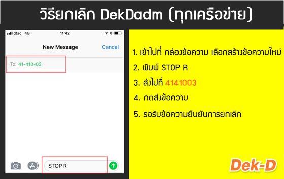 วิธีการยกเลิกระบบ DekDadm (ระบบเก่า) [AIS] กด *414100399 โทรออก หรือ พิมพ์ STOP R ส่งไปที่ 4141003 หลังการยกเลิกจะได้รับข้อความยืนยัน