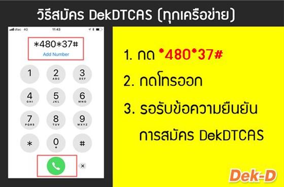 ตอบ เมื่อกดสมัคร *480*37# แล้ว จะได้รับข้อความยืนยันการสมัคร โดยด้านบนของข้อความจะเขียนว่า dekdTCAS หากไม่ได้รับข่าวสาร SMS ภายใน 1-2 วัน ให้รีบติดต่อทีมงานของเว็บไซต์ Dek-D.com ที่ โทร.028601142 ต่อ 143 เพื่อตรวจสอบ