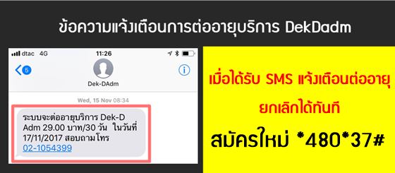 ตอบ ได้ ลูกค้าสามารถใช้บริการ DekDadm ได้จนถึง 31 มกราคม 2561 หลังจากนั้นระบบจะหยุดให้บริการ หากต้องการรับข่าวสารต่อ จะต้องสมัครใหม่ในระบบ DekDTCAS สมัครโดยการกด *480*37#