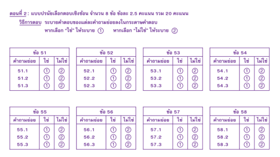 ส่วนพาร์ทที่ 2 เป็นส่วนที่แตกต่างไปจากเดิมอย่างสิ้นเชิง ในปีนี้มีทั้งหมด 8 ข้อ ข้อละ 2.5 คะแนน รวม 20 คะแนน แต่ใน 1 ข้อ จะมี 3 ข้อย่อย ซึ่งจะไม่ใช่การเลือกตัวเลือก แต่จะเป็นการตอบเป็น ใช่ หรือ ไม่ใช่