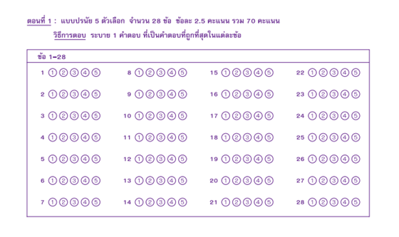 เนื่องจากปีนี้จำนวนข้อในพาร์ทที่ 1 (แบบปรนัย 5 ตัวเลือก) ลดลงเหลือเพียง 28 ข้อ จากเดิมที่มี 32 ข้อ แต่ยังคงเป็นข้อละ 2.5 คะแนนเท่าเดิม