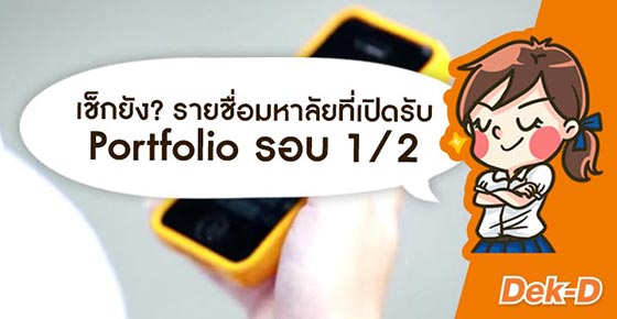 ในการเปิดสมัครสอบรอบ Portfolio 1/2 จะเปิดรับเพียงบางสาขาวิชาและบางมหาวิทยาลัยเท่านั้น วันนี้พี่แนนนี่ก็มีรายชื่อของ 41 มหาวิทยาลัยที่จะเปิดรับสมัคร ในรอบ 1/2 นี้มาฝากน้องๆ กันด้วยค่ะ โดยน้องๆ จะต้องตรวจสอบรายละเอียด ทั้งวันที่เปิดรับสมัคร วันที่ปิดรับสมัคร สาขาวิชาที่เปิดรับและคุณสมบัติต่างๆ จากระเบียบการของแต่ละมหาวิทยาลัยอย่างรอบคอบด้วยค่ะ