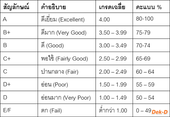 ปกติแล้วน้องๆ จะเห็นการคิดคะแนน หรือเกรดเฉลี่ยเป็นตัวเลขกันตั้งแต่ประถม-มัธยมฯ แตกต่างกับการคิดคะแนน หรือเกรดเฉลี่ยในมหาวิทยาลัย ที่จะใช้เป็นตัวอักษรภาษาอังกฤษ (A B C D E F) ซึ่งบางทีก็มี + (บวก) ตามหลังตัวอักษรเพิ่มมาอีกด้วย