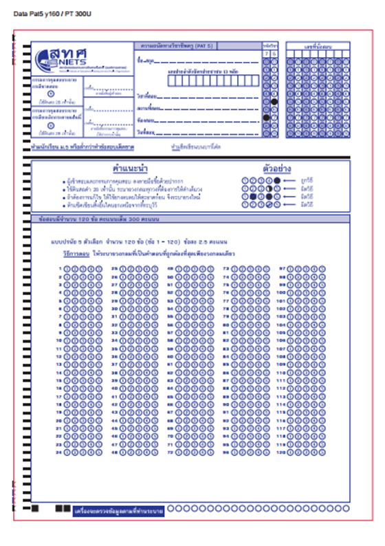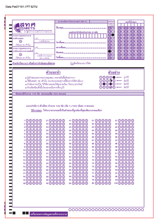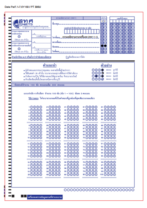 กระดาษคำตอบ PAT 7 ตั้งแต่ PAT 7.1 - 7.7 เป็นแบบปรนัย 4 ตัวเลือก 100 ข้อ ข้อละ 3 คะแนน เหมือนกันทุกวิชาค่ะ