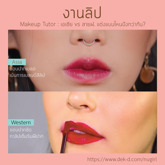 สายฝ. : ชัดเจนมาสำหรับสาวฝรั่ง ที่ส่วนใหญ่จะเน้นการทาลิปแบบเต็มริมฝีปาก ไม่ว่าจะเนื้อแมตต์หรือเนื้อครีม ต้องมีขอบปากที่คมชัดเป๊ะ เก็บรายละเอียดให้คมกริ๊บด้วยคอนซีลเลอร์อีกที ข้อดีคือสาวๆ จะมีริมฝีปากที่สวยได้รูป ข้อเสียคือต้องแต่งหน้าเต็มหน่อยนะคะ เพราะไม่งั้นปากอาจจะดูลอยๆ ได้ค่ะ