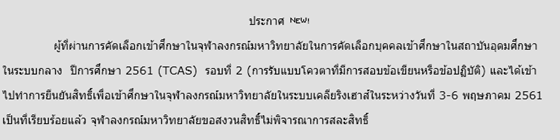 หนึ่งในนั้นก็มีประกาศออกมาเป็นทางการเลย นั่นก็คือ จุฬาลงกรณ์มหาวิทยาลัยค่ ได้ออกประกาศสงวนสิทธิ์ไม่พิจารณาการสละสิทธิ์ให้กับน้องๆ ที่ผ่านการคัดเลือกในรอบที่ 2 นี้ นั่นหมายความว่ายืนยันไปแล้ว จะมาเปลี่ยนใจขอคืนสิทธิ์ไม่ได้นะจ๊ะ