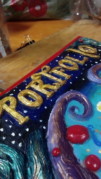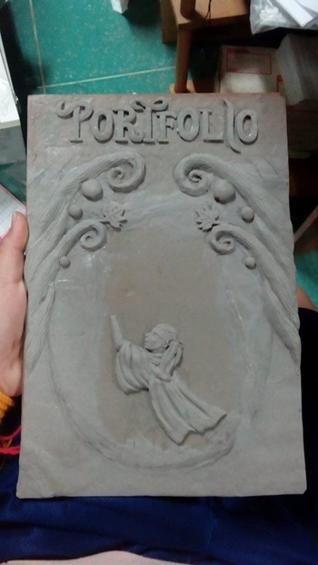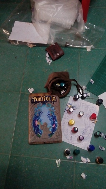 "ตรงหน้าปกค่ะ เราอบดินแล้วระบายสีแล้ว กำลังจะไปส่ง (วันที่ 23) เราก็พยายามประกอบเข้ากับเล่มเนอะ แต่ดันตกแตก ต้องพยายามเอากาวมาติดใหม่ ลนมากเลยตอนนั้น T_T"
