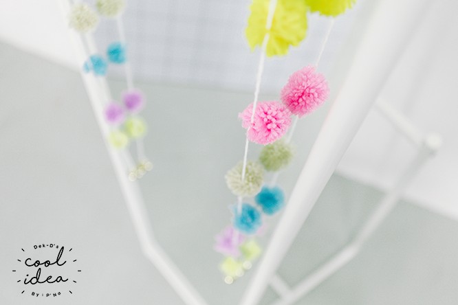 7. มัดปอมปอมติดไปตามที่ชอบเลยค่ะ เสร็จแล้วก็เอามาห้อยแต่งกระจก หน้าต่าง