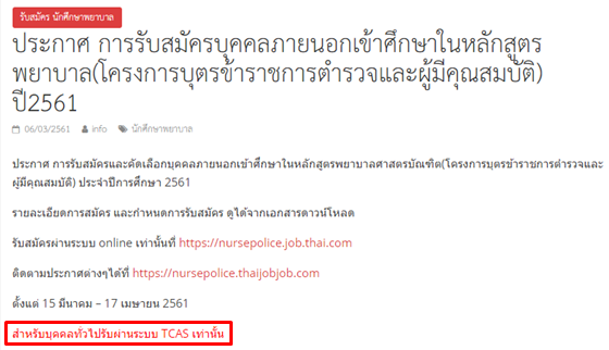 แต่! หน้าเว็บไซต์ได้ระบุข้อความเพิ่มเติมว่า “สำหรับบุคคลทั่วไปรับผ่านระบบ TCAS เท่านั้น” นั่นหมายความว่า น้องๆ ที่ไม่ใช่บุตรข้าราชการตำรวจ หากต้องการสมัครจะต้องรออีกโครงการนึง ที่รายละเอียดกำลังจะมาเร็วๆ นี้ และโครงการนี้เข้าระบบ TCAS ค่ะ ดังนั้น ปีนี้ใครจะสมัครพยาบาลตำรวจ ก็ต้องวางแผนให้ดี เพราะเข้าระบบ TCAS ก็จะต้องใช้สิทธิ์เคลียริงเฮาส์ร่วมกับการเลือกคณะอื่นๆ นั่นเอง