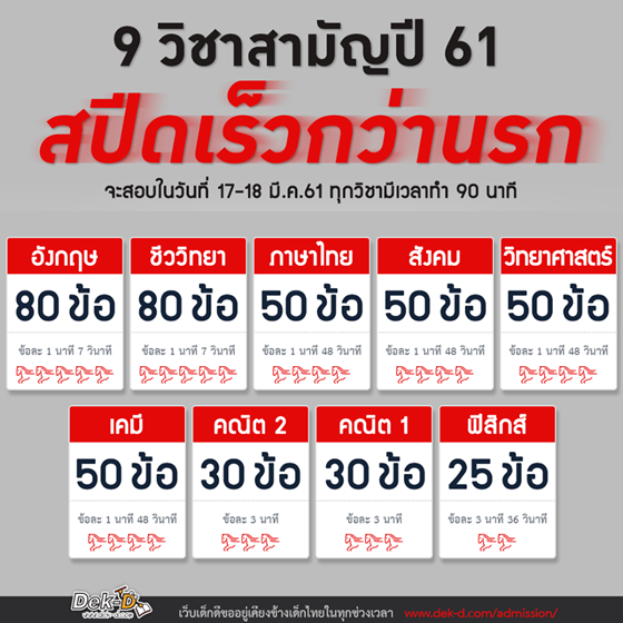 จากคำกล่าวขานของรุ่นพี่หลายๆ รุ่น ข้อสอบ 9 วิชาสามัญ เป็นข้อสอบที่มีจำนวนไม่มาก แต่ต้องแข่งกับเวลามาก