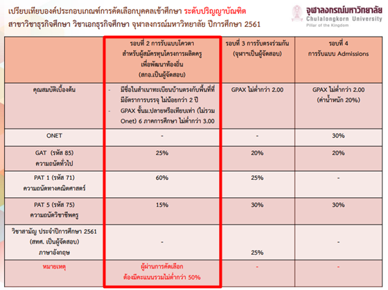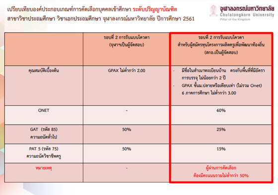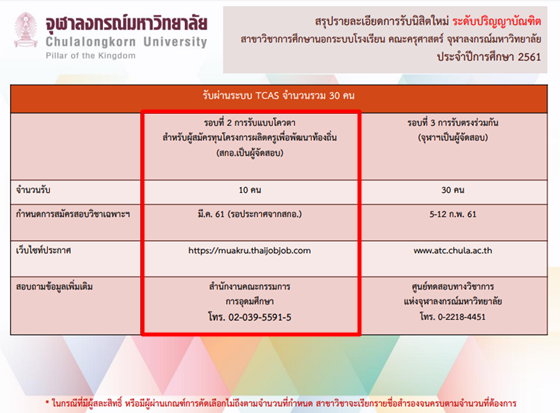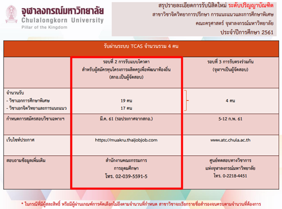 ล่าสุด! จุฬาลงกรณ์มหาวิทยาลัยได้เปิดเผยรายละเอียดการรับสมัครนิสิตคณะครุศาสตร์ ในโครงการผลิตครูเพื่อพัฒนาท้องถิ่น ที่จะเปิดรับสมัครในรอบที่ 2 ทั้งหมด 7 สาขาวิชา (174 ทุน) ได้แก่