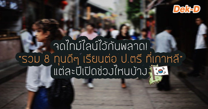 สำหรับน้องๆ Dek-D.com คนไหนที่มีความสนใจจะเรียนต่อปริญญาตรีที่ประเทศเกาหลี แต่ไม่รู้ว่าแต่ละทุนนั้นเปิดรับสมัครช่วงไหนบ้าง วันนี้ พี่วุฒิ ได้รวบรวม 8 ทุนการศึกษาดีๆ เรียนต่อที่เกาหลีมาให้น้องๆ ได้จดลิสต์ไว้ในไทม์ไลน์ก่อนลุยสมัครกันครับ มีทุนอะไรบ้าง มาดูกัน!